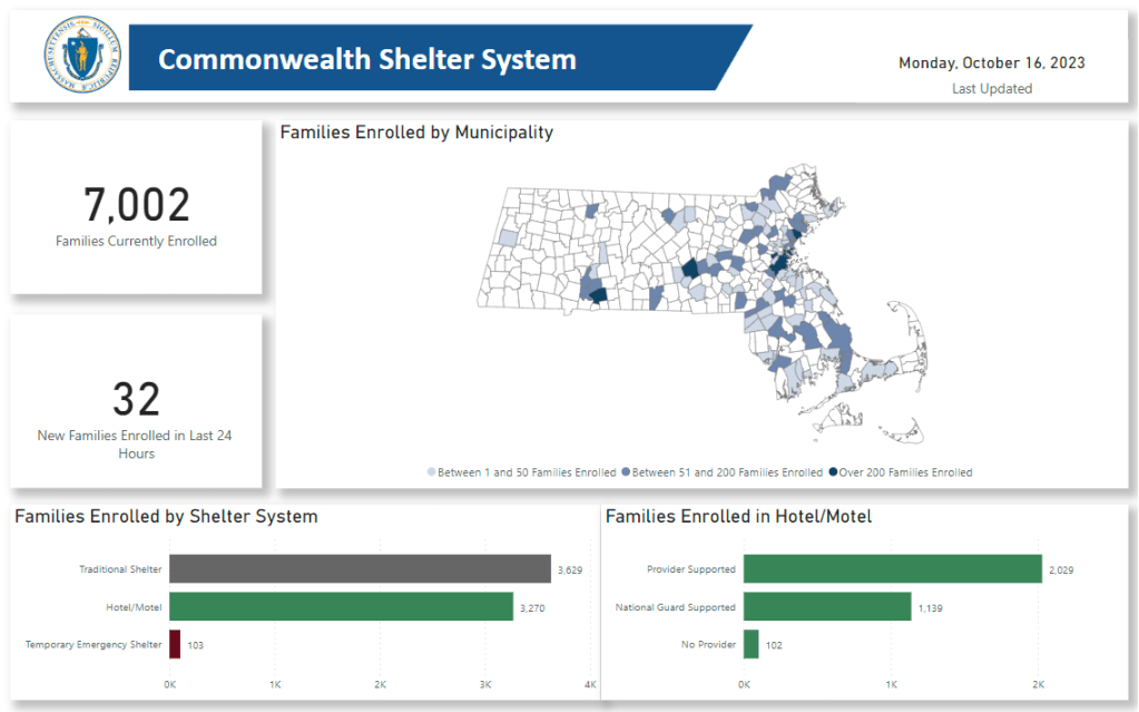 Keep track and stay informed about the number of families currently enrolled in the Commonwealth Shelter System. Note: The data does not distinguish between Massachusetts citizens and migrants (undocumented or otherwise). Also, the numbers are presented as ranges rather than exact numbers.