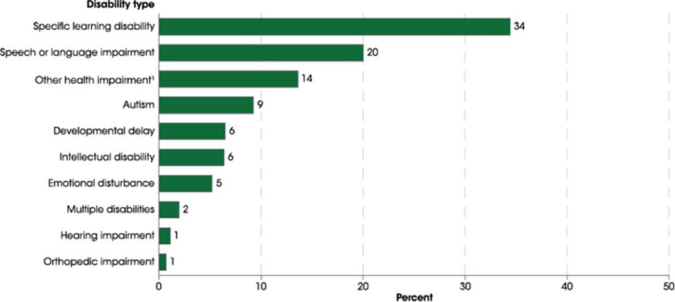 NOTE: Deaf-blindness, traumatic brain injury, and visual impairment are not shown because they each account for less than 0.5 percent of students served under IDEA. Due to categories not shown, detail does not sum to 100 percent. Although rounded numbers are displayed, the figures are based on unrounded estimates(U.S. Department of Education, 2017).