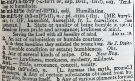 Note the first phrase of the first definition: “State or quality of being humble in spirit”. And the second phrase: “freedom from pride and arrogance”. They seem to give humility a more positive tone, like a quality a person would want to have. And it seems to coincide with my (possibly old-fashioned) definition. Granted, the third phrase: “lowliness of mind” is negative.