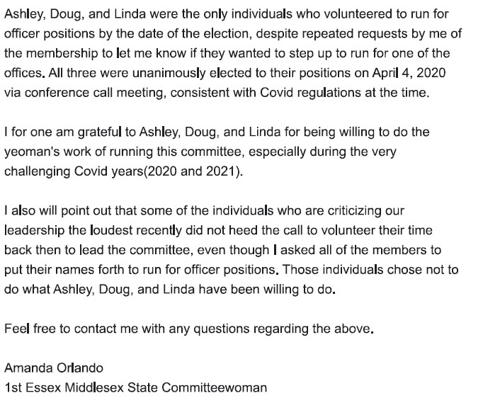 In addition to smearing State Committeewoman Orlando’s parents as a way to delegitimize her, they also accused her of campaign finance fraud in a May 29th letter to MassGOP Chairwoman Amy Carnevale. Those accusations had already been deemed unwarranted by Carnevale on May 22nd.