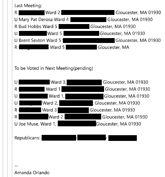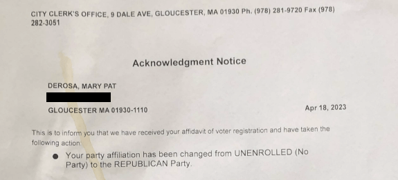 On June 8, Orlando emailed Derosa, who was seeking a seat as Ward 4 City Councilor, to let her know she was listed as Unenrolled in the GOP database. Derosa’s campaign manager, Nicole Coles, responded to Chairwoman Sullivan, stating that the “City Clerk in Gloucester says otherwise” and calling Sullivan a liar. After days of back and forth, Derosa provided proof of her Republican registration to Orlando in an email on June 16. Orlando responded by explaining the flow of registration data and how there can be a delay at the National GOP level.