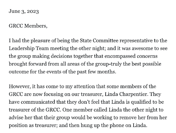 On June 13, Bjorlie mailed and emailed a letter to all GRCC members calling for new leadership. The letter was signed by the usual suspects, including GRCC Vice Chair Clayton Sova.