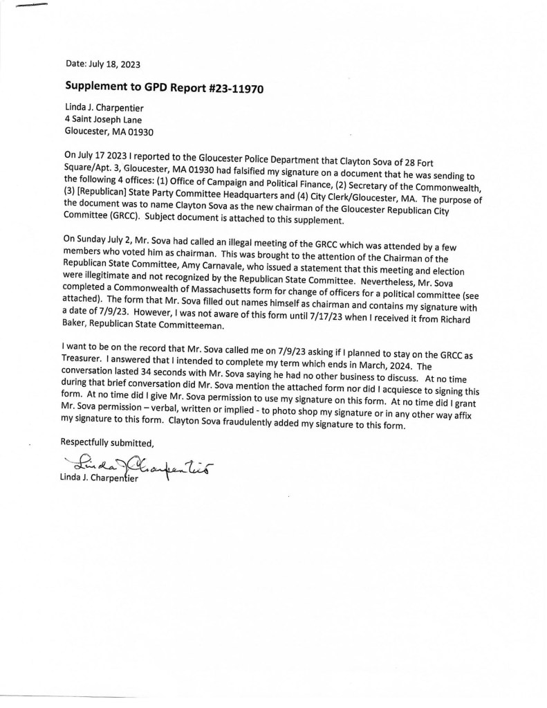 [8] Gloucester MA GOP. (2023b, July 21). Clayton Attempts to File Falsified Form with Government Entities.