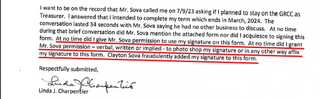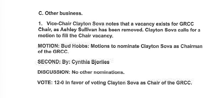The day after the GRCC June monthly meeting, using his personal email and co-opting the official GRCC letterhead, Clayton Sova announced a “Special Meeting” to be held on July 2 with the stated purpose: “to remove the chairwoman for cause.”1
