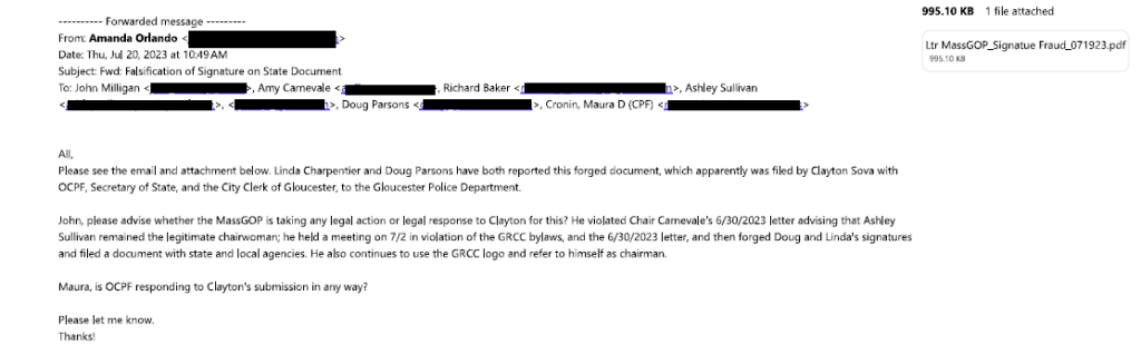 State Committeewoman Amanda Orlando emailed Mass GOP leadership, including Chairwoman Amy Carnevale and Maura Cronin, the OCPF legal advisor, alerting them to Sova’s fraudulent filing and asking if they would take any legal action.7