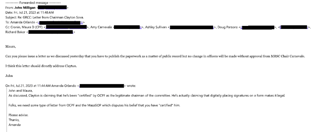 Mass GOP leadership, GRCC leadership, and the OCPF legal advisor discussed which appropriate steps should be taken to address Sova’s actions, as referenced in this July 21st email from John Milligan, the Executive Director of Mass GOP.10