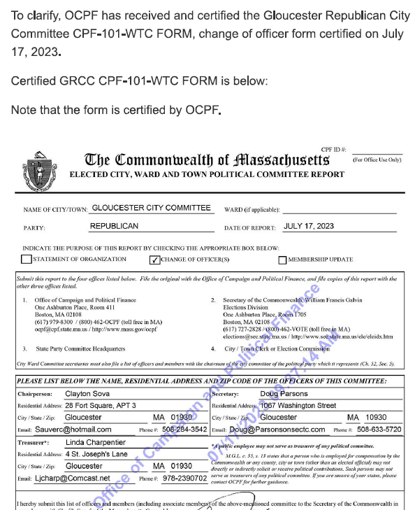 On July 17, 2023, Clayton Sova sent a “Change of Officers” form to the OCPF, naming himself as the new Chairman of the GRCC. 5