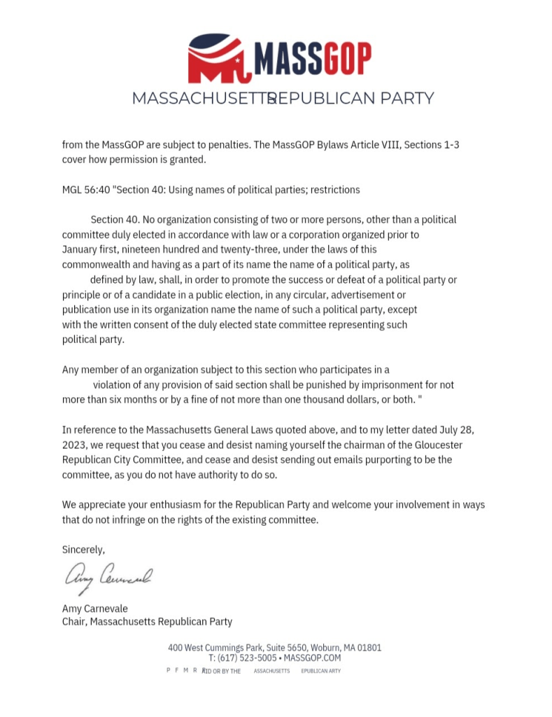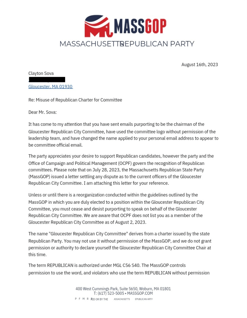Finally, on August 16th, Mass GOP Chairwoman Amy Carnevale issued Clayton Sova a “Cease and Desist” letter.7
