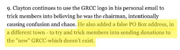 At 6:17 p.m. on August 8th, about a week after receiving the letter from the GRCC leadership alerting him that he and his cohorts had been voted out of the committee, Clayton Sova emailed members, pretending to be the chairman and using the GRCC label for his personal email. 5 He announced a “Special Meeting” for August 19th with the agenda of removing Treasurer Linda Charpentier and Secretary Doug Parsons.