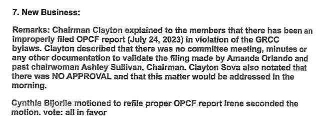 Recall that Chairwoman Ashley Sullivan had scheduled the official July 26th meeting virtually on Zoom, not in person. The agenda was to vote out the six core members of the opposition group: Clayton Sova, Irene Sova, Robin Hubbard, Cynthia Bjorlie, Nicole Coles, and Bud Hobbs. The meeting was held at 7 p.m., and after the full motion was read, the malcontents were unanimously voted out of the committee. Five people, whose addition to the committee had been hampered by the six former members, were voted into the GRCC.1