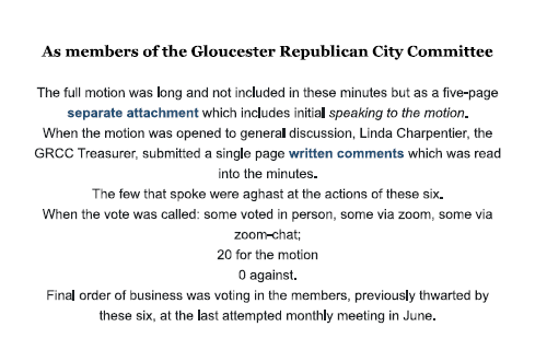 On September 27th, the real and actual Gloucester Republican City Committee held its first monthly meeting without interference from Sova, Bjorlie and their cohorts. According to a follow-up email from Chairwoman Sullivan, the meeting was “very calm and productive,” they enjoyed a “peaceful discussion,” and the “meeting progressed in accordance with the agenda.”11