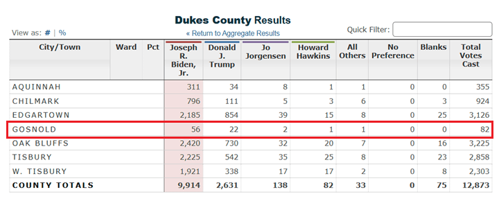 Some municipalities allow non-residents to vote in local elections, where issues affecting property owners are more immediate. That scenario may be reflected in the above number. Next, I looked at the election results to see how many votes were cast in Gosnold in the 2020 Presidential Election.[3]