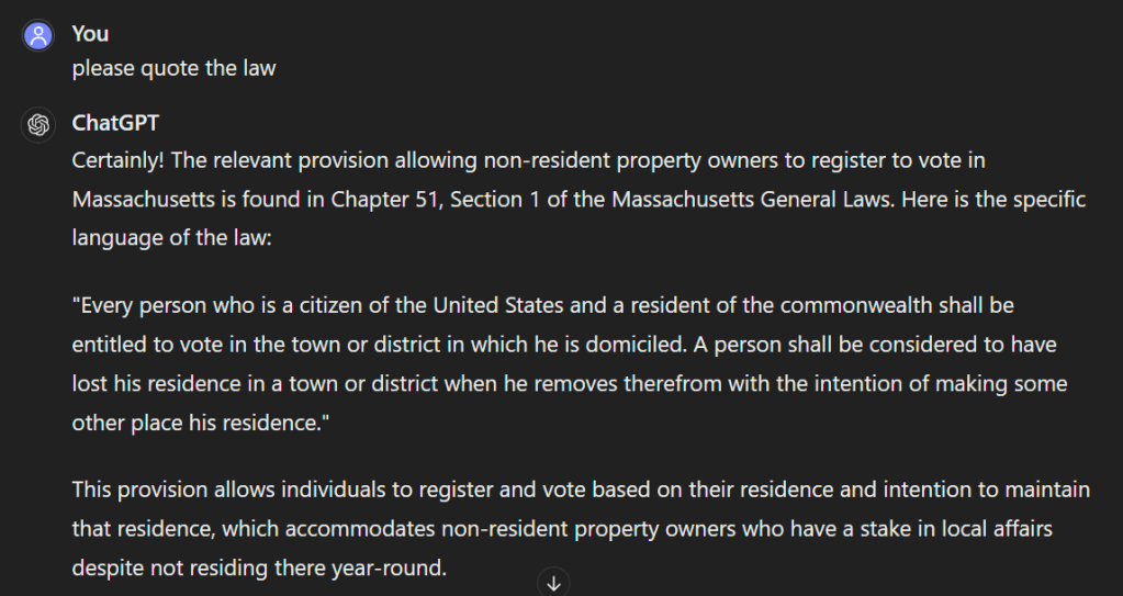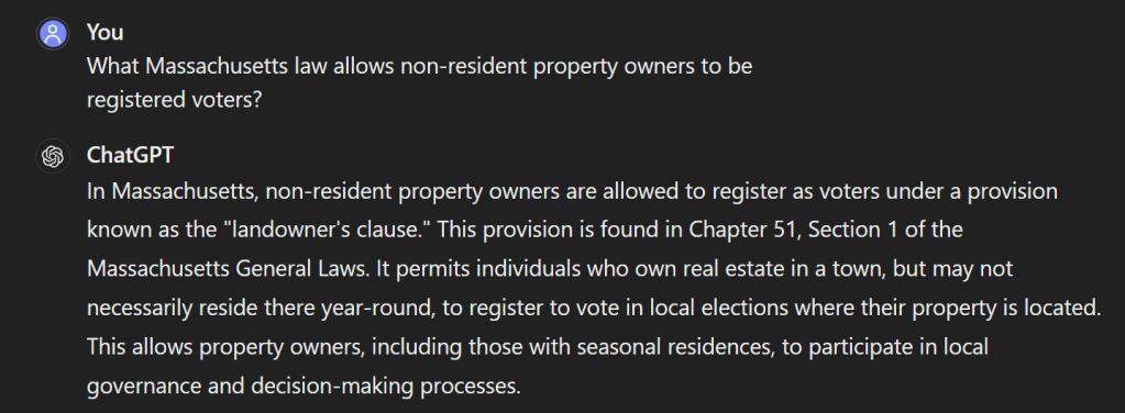 The search results do not mention any Massachusetts law that grants voting rights to non-resident property owners. The situation in Gosnold, where many non-resident property owners are registered voters despite not living there full-time, appears to be an anomaly enabled by the town’s unique circumstances rather than state law.