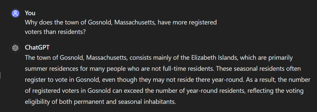 “Gosnold, Massachusetts has more registered voters than residents because many non-resident property owners are eligible to register to vote in the town.[3][4]