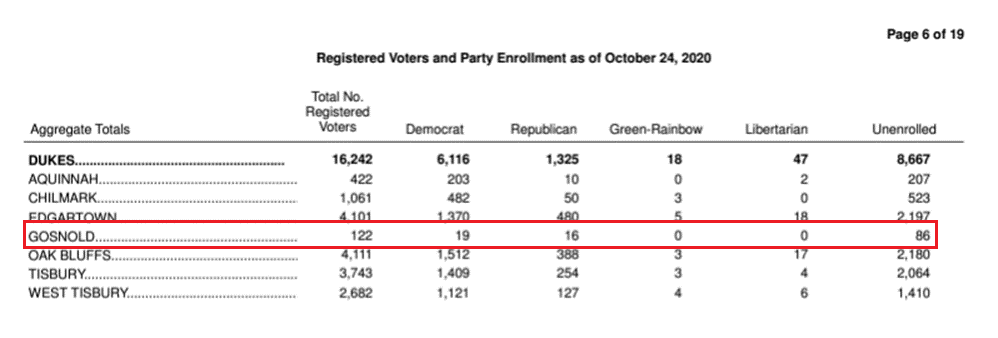 While the 2020 census reported only 70 residents in Gosnold, the town’s voter registration data from October 2022 shows 112 registered voters.[1] This discrepancy is likely due to non-resident property owners, such as summer residents or those who own vacation homes on the Elizabeth Islands that make up Gosnold, being allowed to register to vote in the town despite not being full-time residents.[2]