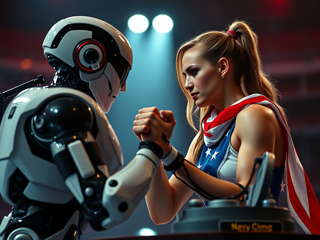 Just for fun, I asked AI to create an image using this prompt: a female patriot winning an arm-wrestling match against AI