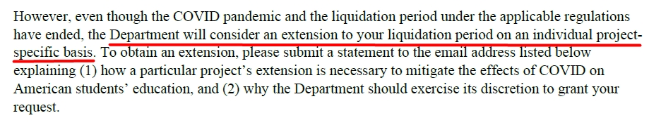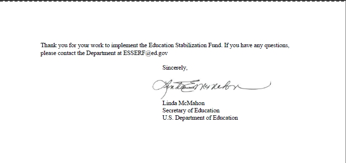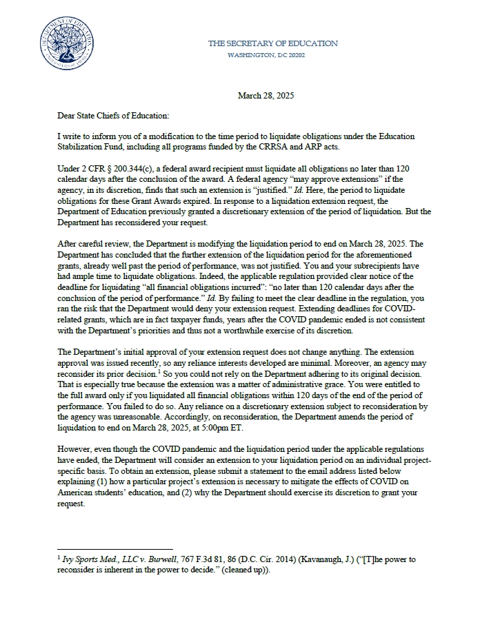 On April 1st, Linda McMahon, Secretary of the Department of Education, sent a letter to the Education Chiefs in each state modifying the liquidation period of the Education Stabilization Fund to end retroactively on March 28, 2025.