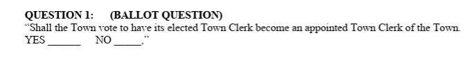 Charlton held their annual town election on May 3rd and voted to put the question of whether to change the position of Town Clerk from elected to appointed on the ballot:
