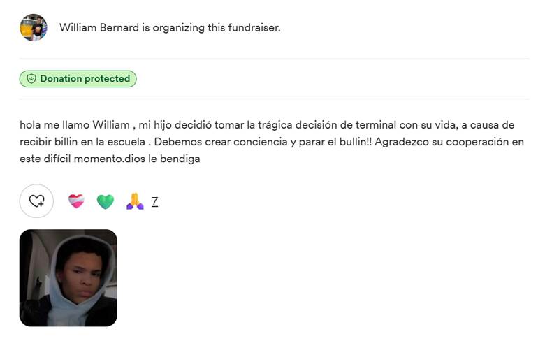 Hello, my name is William. My son made the tragic decision to end his life as a result of being bullied at school. We must raise awareness and stop bullying! I appreciate your support during this difficult time. God bless you.